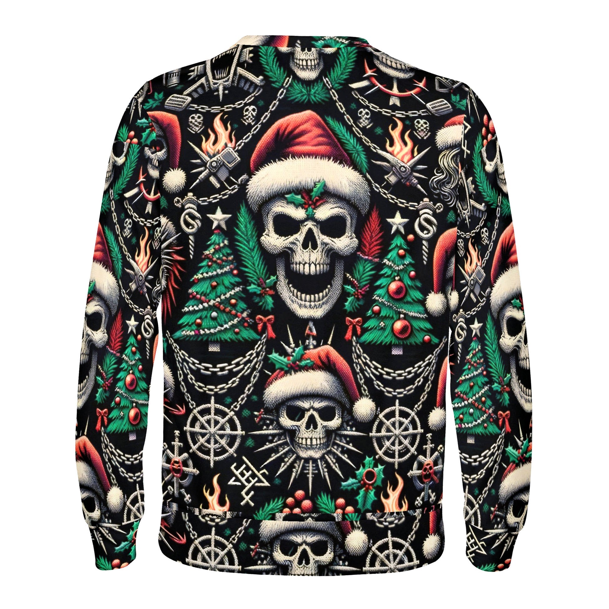 Skulls in Santa hats—sharp grins framed by holly, trees, and deep festive reds and greens, all arranged in a rich, symmetrical tapestry of rebellion.