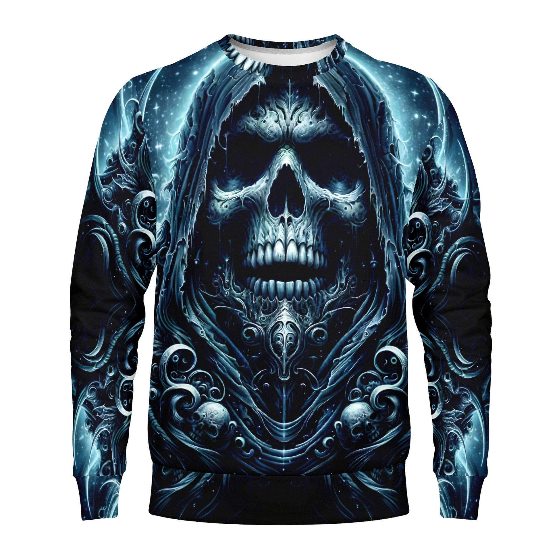 The Ebon Constellation Cotton Terry Sweatshirt pulls no punches. From the shadows, a skull emerges—hooded in darkness, adorned with cosmic geometry, wrapped in swirls of midnight blue and icy white. It’s more than an image. It’s a vision. Ethereal. Ominous. A design that whispers the infinite, while staring you dead in the eye.