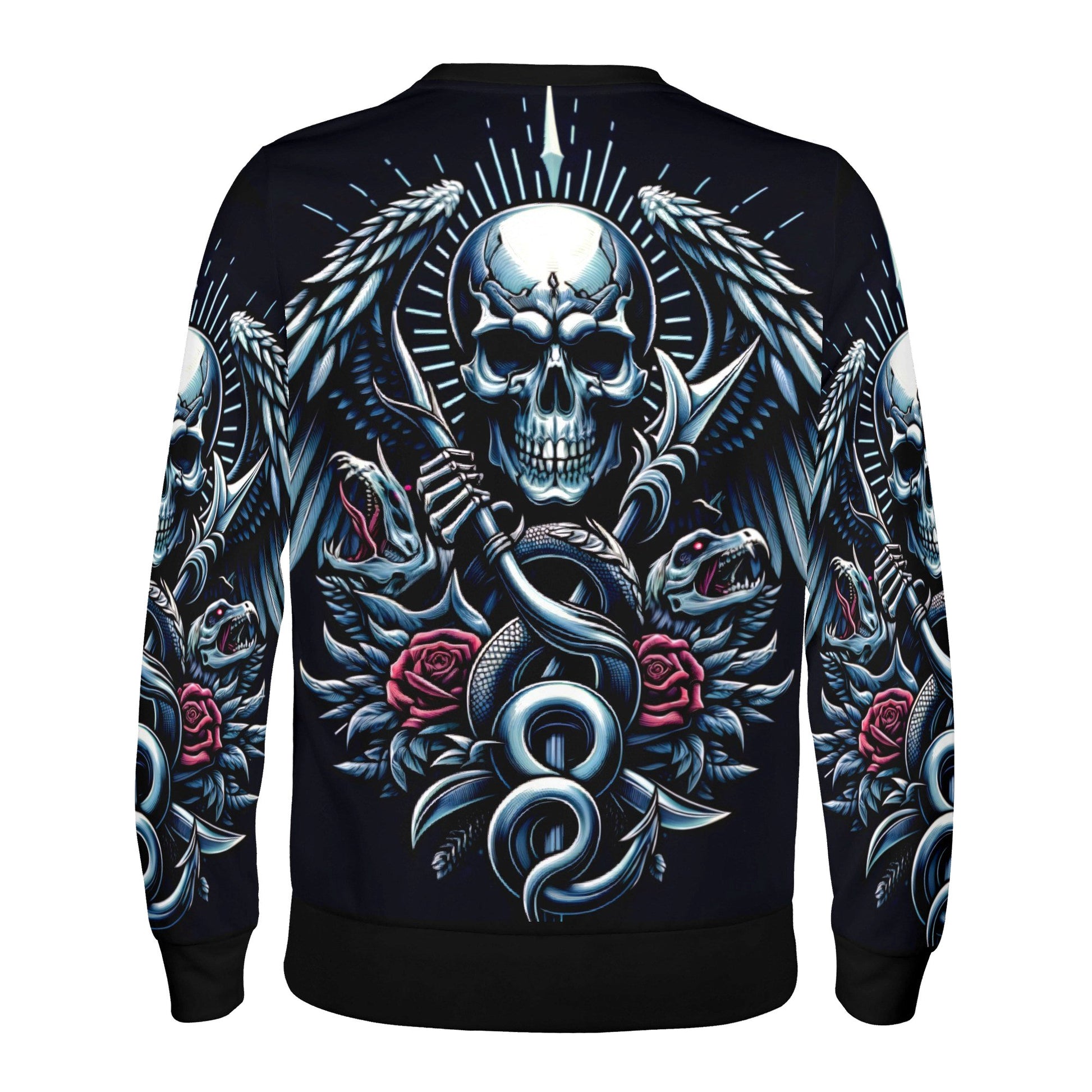 The Gothic Ascendancy Poly French Terry Sweatshirt isn’t a garment—it’s a declaration of defiance. A central skull, crowned with intricate wings, dominates the canvas, while two snarling serpents coil with unrelenting menace. Red roses punctuate the monochrome and icy blue palette, merging life, death, and duality into a design that’s both beautiful and dangerous.