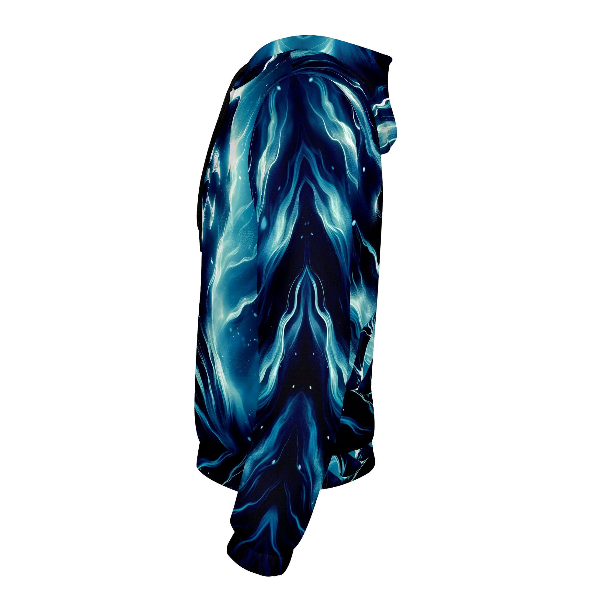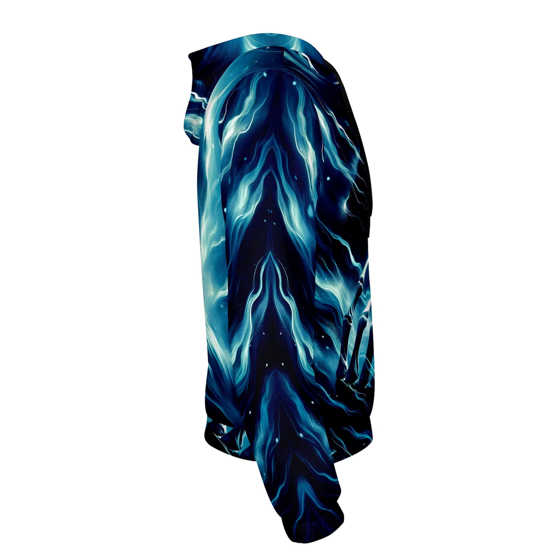 Darkness and light collide in the Luminous Grave Poly French Terry Hoodie—a spectral statement piece for those who walk between worlds. A skull draped in swirling blue-and-white wisps emerges from the shadows, surrounded by luminous tendrils that radiate raw, otherworldly energy. Depth, shadow, and spectral light give this design a haunting power that’s impossible to ignore.
