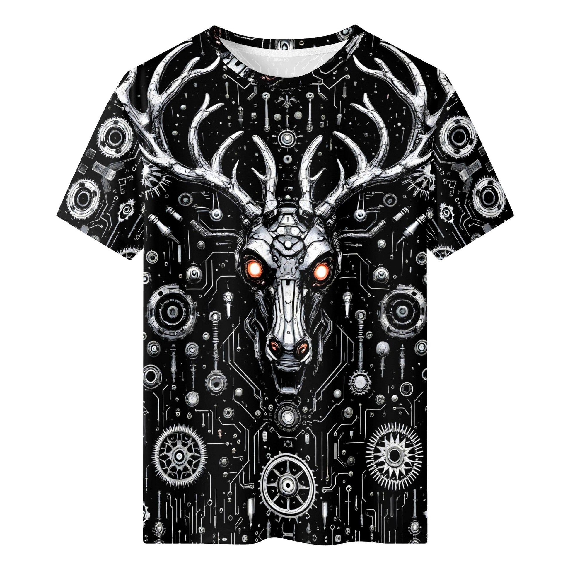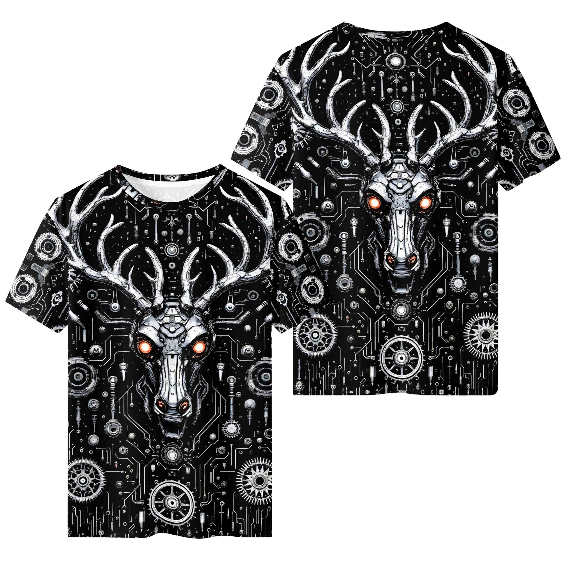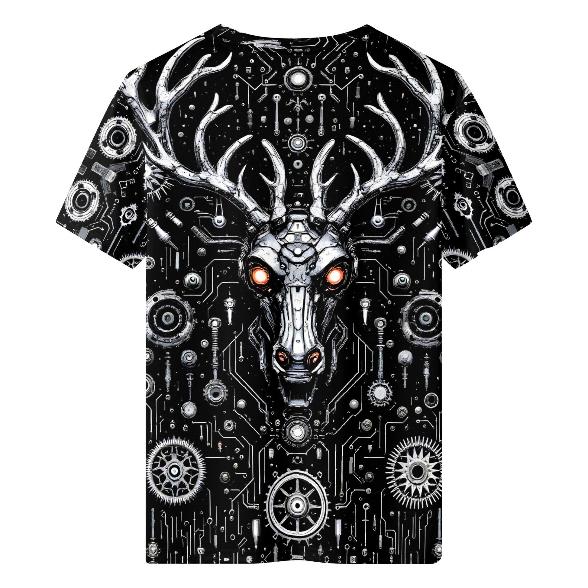This isn’t your grandma’s Christmas tee. The Red-Eye Revenant T-Shirt by Loud & Lethal smashes holiday clichés with unapologetic force. Front and center, a metallic stag with glowing red eyes stands like a guardian from the digital underworld—its form built from a labyrinth of gears, circuits, and mechanical symmetry. Think pagan folklore crash-landed into a cyberpunk future, rendered in raw tones of black, white, and searing orange.