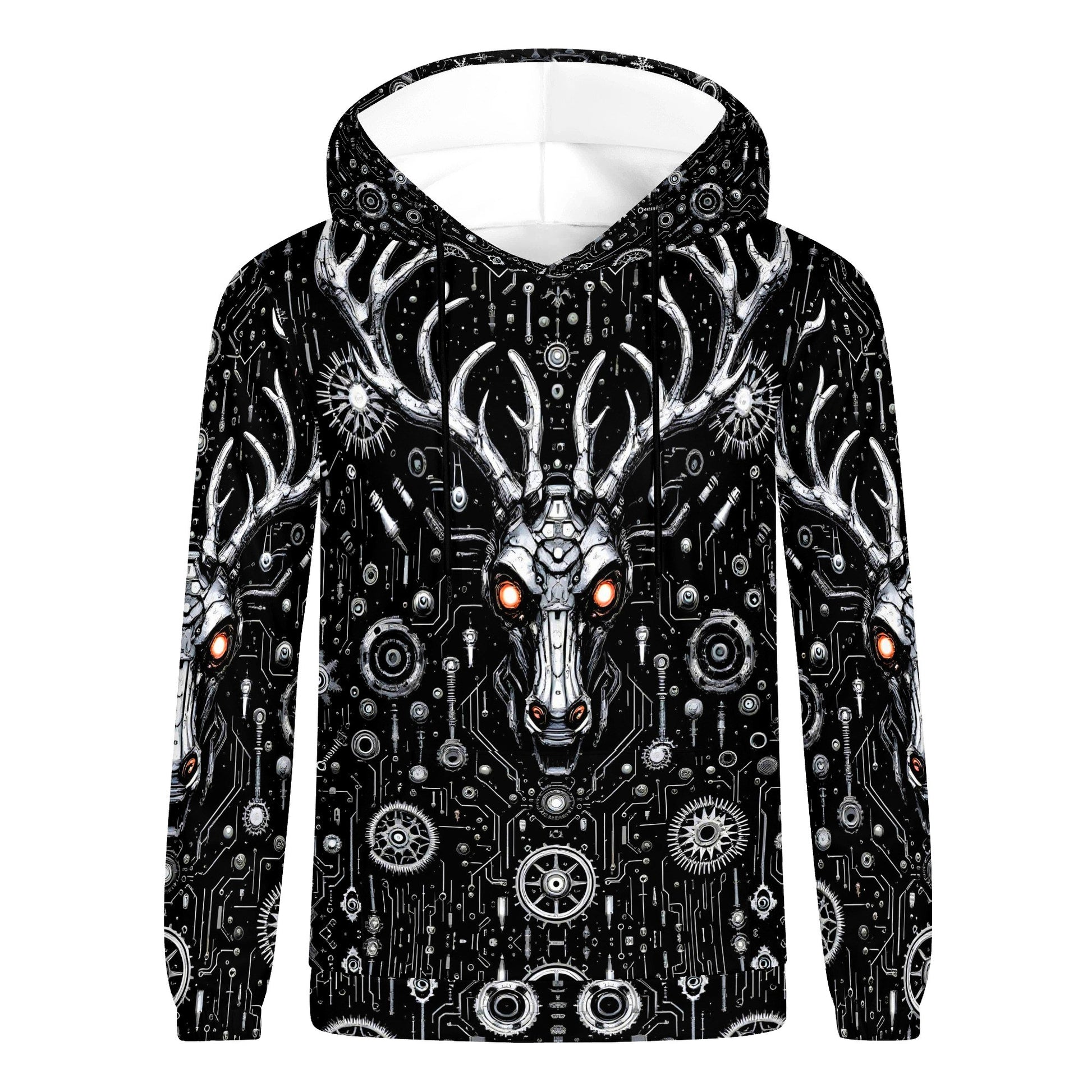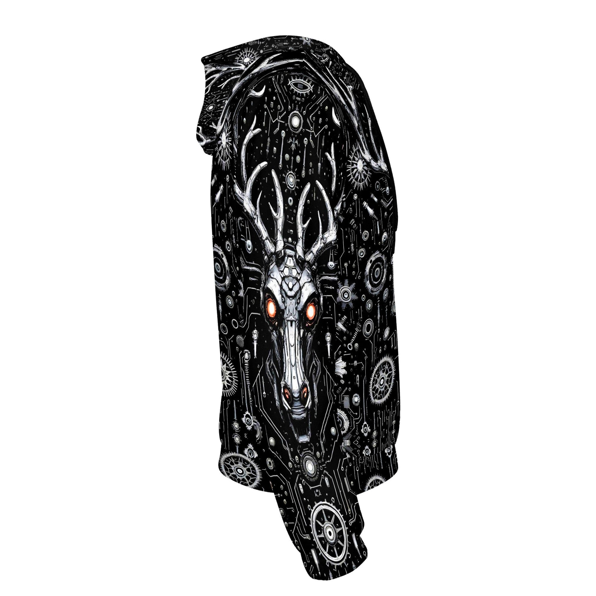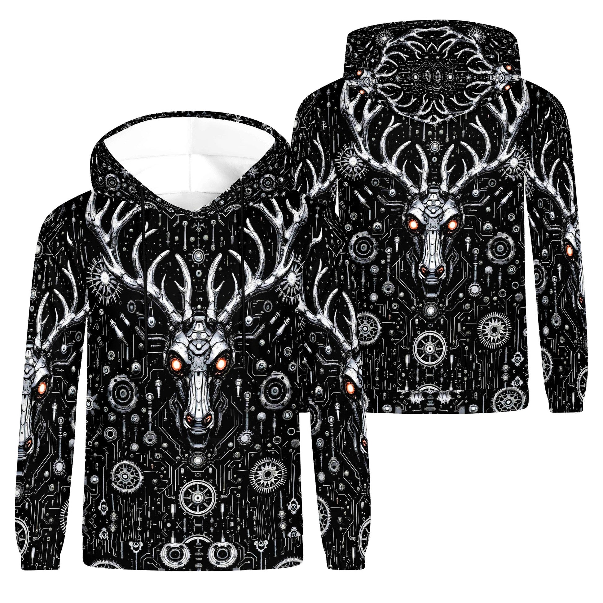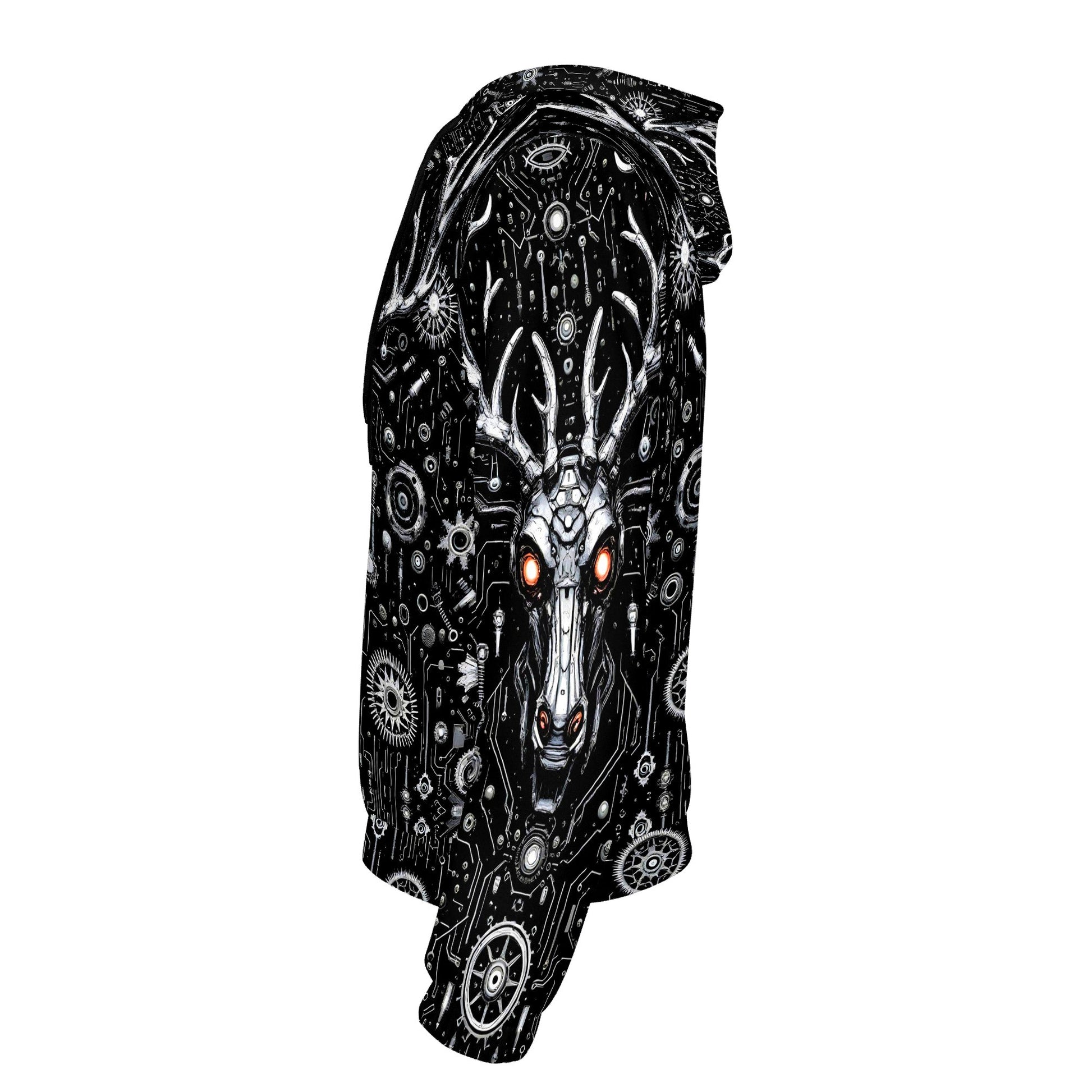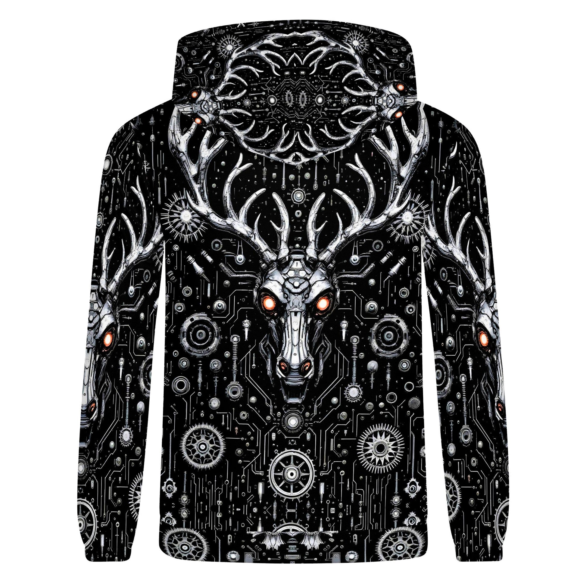 Forget cozy clichés. The Red-Eye Revenant Hoodie is forged for those who thrive in the clash between primal instinct and future tech. Front and center, a metallic stag with glowing red eyes stares back—untamed, untouchable, and unstoppable. Behind it, a labyrinth of gears, circuits, and symmetrical chaos fuses nature’s brutality with a cybernetic edge.