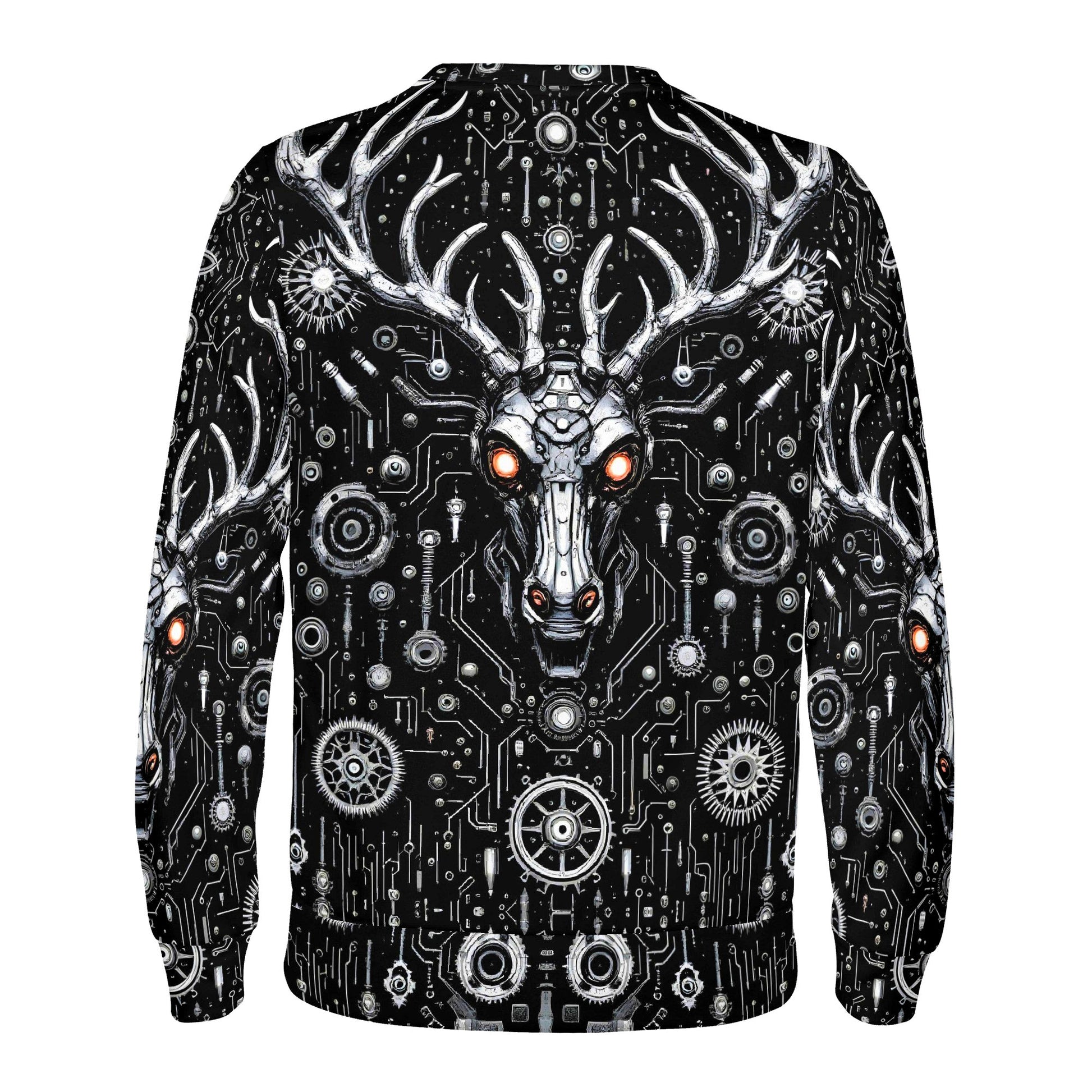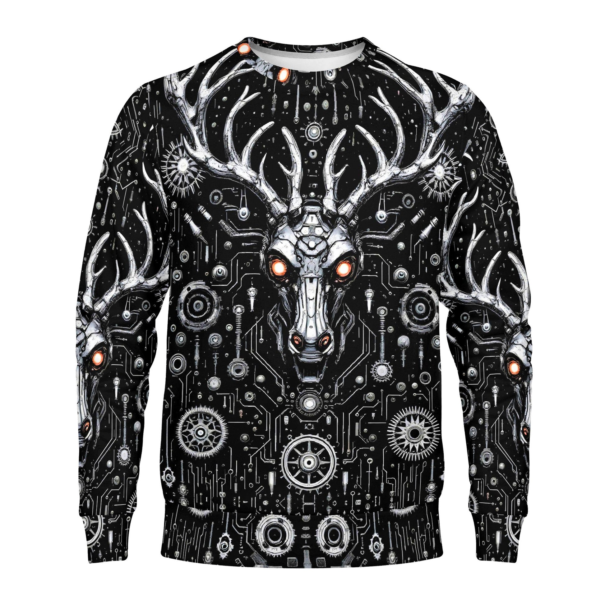 At the heart of this design stands a metallic stag with glowing red eyes, framed by a labyrinth of gears, circuits, and intricate patterns. Black, white, and orange hues dominate the image, creating a futuristic, cyberpunk-infused aesthetic. This is holiday apparel for metalheads, punks, goths, rockabillies, and bikers who refuse to blend into the mundane.