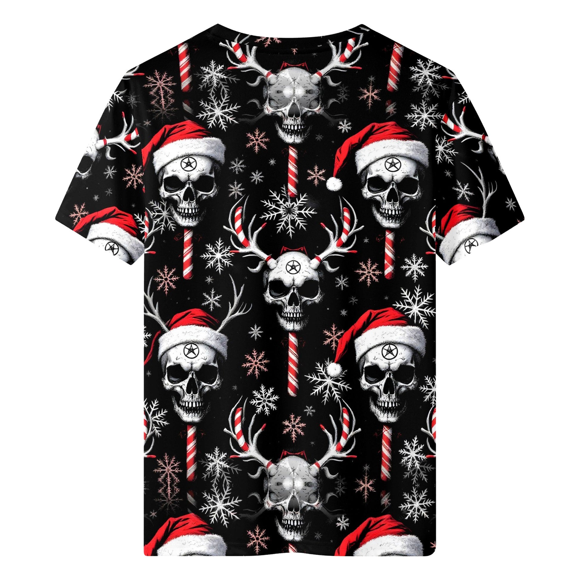 The Sugar & Skull T-Shirt by Loud & Lethal tears up holiday conventions. Featuring skulls wearing Santa hats, candy canes, and intricate snowflakes, this design fuses festive cheer with gothic grit. The dark background punctuated by vivid red accents creates a striking contrast that’s both visually compelling and unapologetically rebellious.